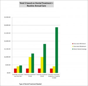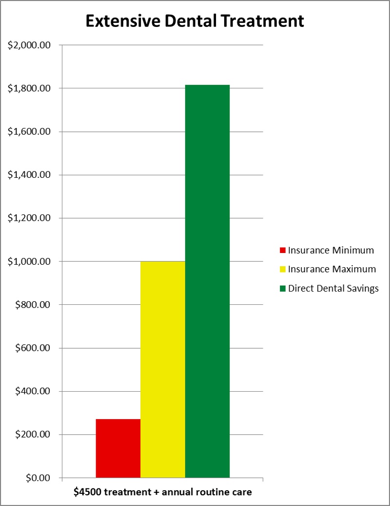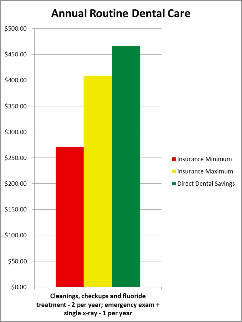Remember, with Direct Dental Savings your routine annual care is free. With insurance your routine annual care counts against your annual maximum payment and limits your savings on any other needed dentistry.