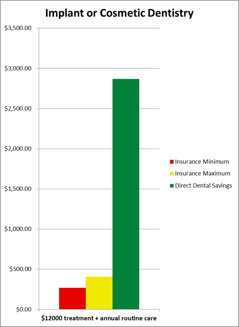 If you need cosmetic or implant dentistry, Direct Dental Savings will save you dramatically more than insurance. In fact, insurance rarely covers implant care and virtually never covers cosmetic dentistry. Direct Dental Savings saves you 20% of your total costs on all these procedures. This can be many thousands of dollars depending upon the extent of treatment and your total treatment costs. Once again, Direct Dental Savings saves you more!