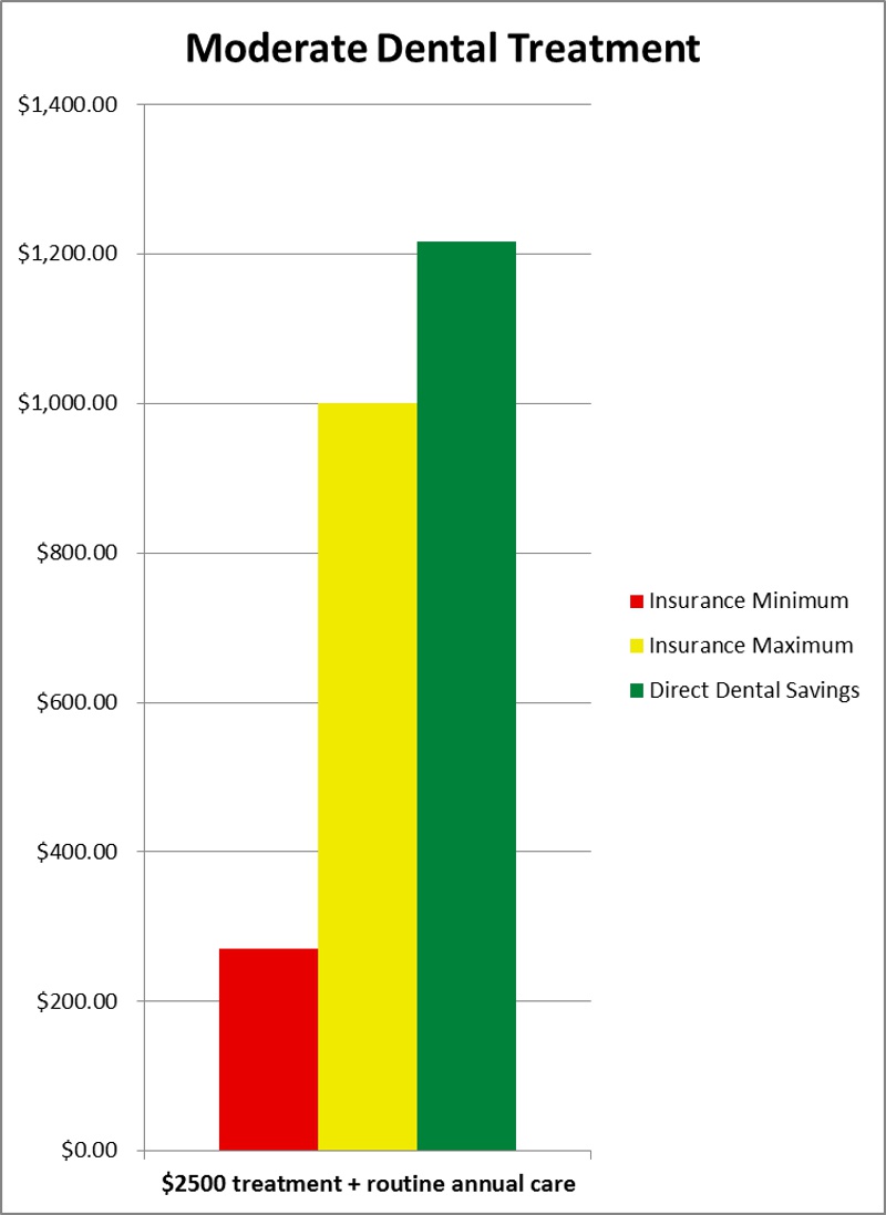Compare the Direct Dental Savings plan to insurance on moderate treatment. If you need $2500 in dental treatment in addition to your routine annual care, the DDS plan can save you more. Insurance will always stop paying at the annual maximum benefit plan. Typically, we see this at $1000. In addition, depending upon the insurance policy restrictions (fee allowances, reimbursement percentages, procedural exclusions) you can see a range of payment from a low of $ up to the annual maximum benefit limit. But with insurance, you always have to sort through which procedures you are having done to decode what your insurance will pay and how much will be paid. Typically, this involves predetermination of benefits and lots of both time and paperwork. With Direct Dental Savings it is very simple, you can know virtually on the spot how much you’re going to save. Direct Dental Savings has no annual maximum, you simply save more!